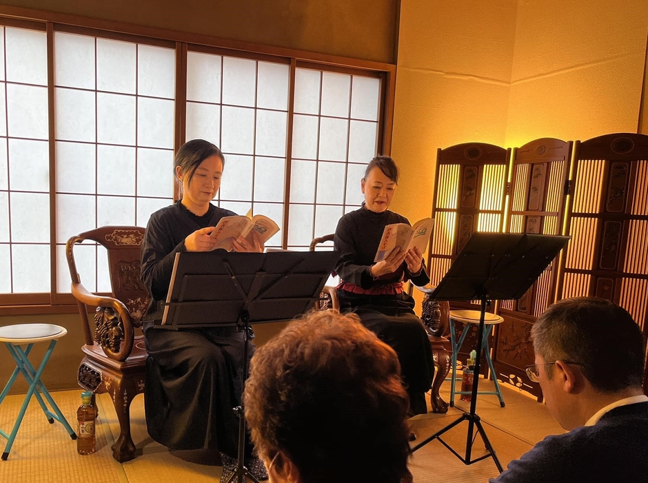 伊香保温泉石段街からほど近い射的居酒屋「喜楽」大広間で、1919(大正8)年出版の『伊香保みやげ』(伊香保書院)からリーディング公演を行いました。出演は、東京を中心に活躍する女優の神由紀子(朱の会主宰)と、とろんぷ・るいゆ主宰の中村ひろみで、萩原朔太郎や夏目漱石と伊香保温泉の関わり等を解説しながら、随筆を朗読。公演をきっかけに観光に訪れた観客は、伊香保の紅葉がもっとも美しいこの時期に、伊香保温泉の今と昔の風情を楽しみました。映画監督・飯塚花笑の撮影・編集による記録動画を後日、徳富蘆花記念文学館(群馬県渋川市伊香保町)に寄贈します。