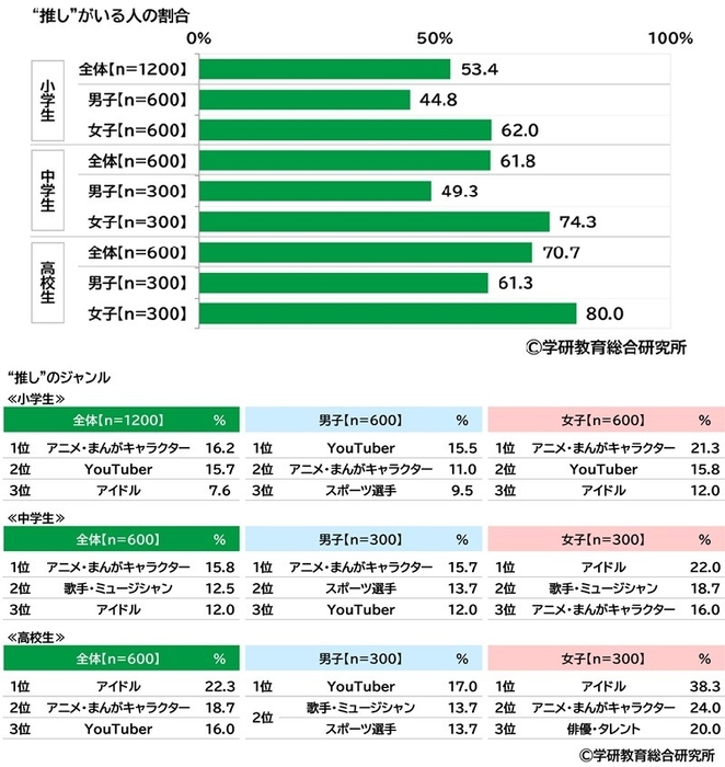 学研教育総合研究所調べ 「“推し”がいる」 小学生53%、中学生62%、高校生71% “推し”のジャンル1位は? 小学生男子と高校生男子は「YouTuber」、 中学生女子と高校生女子は「アイドル」、 小学生女子と中学生男子は 「アニメ・まんがキャラクター」