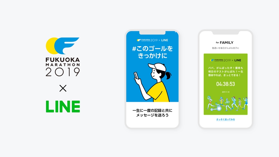 LINE株式会社(本社:東京都新宿区、代表取締役社長:出澤 剛)、福岡を拠点とする子会社のLINE Fukuoka株式会社(本社:福岡県福岡市博多区、代表取締役社長:落合 紀貴)は、11月10日に実施される福岡マラソン2019のOFFICIAL COMMUNICATION PARTNERに就任いたしました。2017年・2018年に続き3年目の就任となる今年は、「マラソン大会史上最高に、ランナーと応援者がつながり、楽しめる大会」を目指し、4施策を実施します。中でも、自身の完走タイムとメッセージを入れたカードを「LINE」でつくって送ることができる「THANKS CARD」企画は、全国のマラソン大会史上初の試みとなります。また、前提として「円滑な大会運営」を行うための3施策も実施。計7つの施策を実施しますので、お知らせいたします。