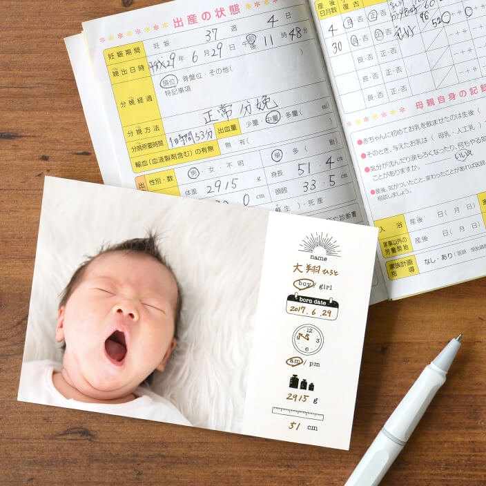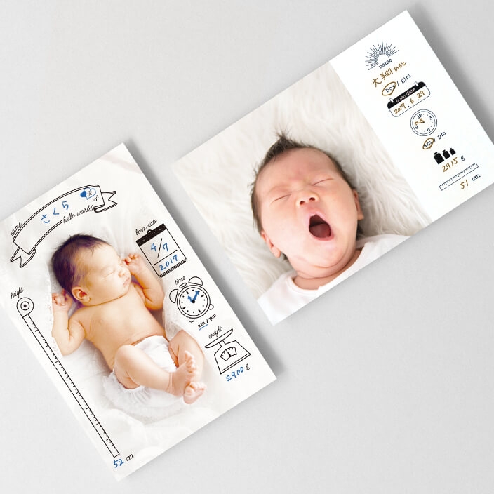 欧米で一般化している「ニューボーンフォト」は、生後約3週間の新生児を写真に残すこと。そのニューボーンフォト(この時期にしか撮れないメモリアルな写真)を使い、身長、体重、生まれた日などを記入した出産の報告ハガキ「バースアナウンスメント」を作る風習があります。