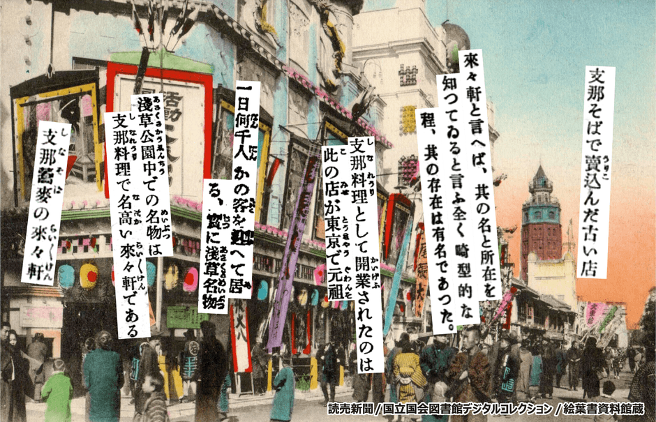 來々軒にまつわる文献は数多く存在します。「一日何千人かの客を迎へて居る、実に浅草名物」(読売新聞)、「支那そばで売込んだ古い店」(大東京うまいもの食べある記)、「來々軒と言へば、其の名と所在を知ってゐると言ふ全く畸型的な程、其の存在は有名であった」(浅草経済学)。これらの文献から、來々軒がいかに有名で繁盛していたかが伺えます。