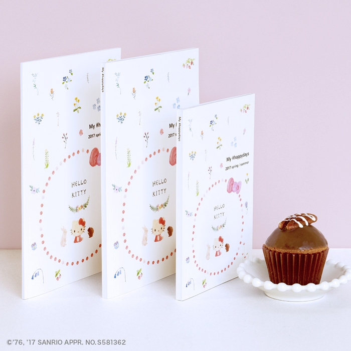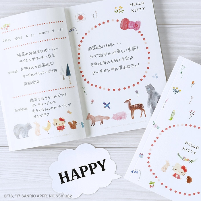 可愛い動物やお花とハローキティが水彩画タッチで描かれた素朴なテイスト。小さくて、さりげないキティちゃんがたまらない可愛さ。