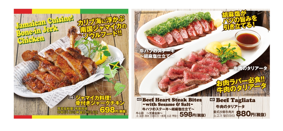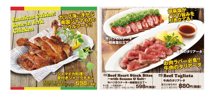 総料理長がおすすめする「7種のスパイスで食べる スパイシーフライドチキン」や「豚トロと半熟玉子の石焼飯」、「鶏せせりのねぎまみれ」などが新メニューとして登場。また、大人気メニュー「牛肉のタリアータ」や、昨年、新登場の人気メニュー「ジャマイカ料理!骨付きジャークチキン」「牛ハツのステーキ ~胡麻塩仕立て~」も引き続き、販売します。