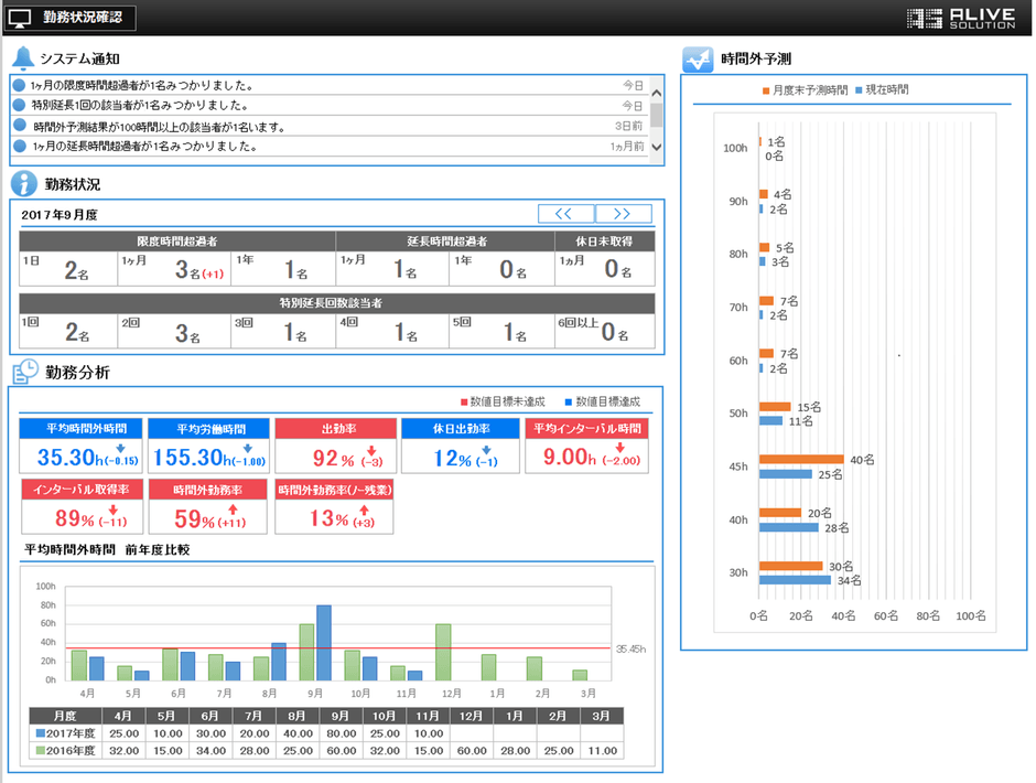 「ALIVE SOLUTION TA」バージョン6.3では、従来強みを持っている遵法管理機能をより一層強化。特に人事総務部門向け機能として労働時間の実績を「分析」し、今後の「予測」を行い、問題を未然に「予防」するポータル画面を新たに追加。また多様化する働き方に向けて各種IoT機器と連携を強化することで、人事総務部門の負荷軽減と労務コンプライアンスの遵守を支援します。