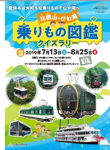 比叡山延暦寺や京阪グループなどにより、比叡山観光の振興を目的として組織された比叡山振興会議では、2019年7月13日(土)から8月25日(日)まで、比叡山・びわ湖エリアで運行するさまざまな乗りものを紹介する図鑑風のパンフレット「比叡山・びわ湖 乗りもの図鑑」を使ったクイズラリーを開催します。比叡山・びわ湖エリアにクイズ出題スポット(5カ所)を設置し、クイズに解答された方全員に「達成賞」として賞状と景品をプレゼントします。