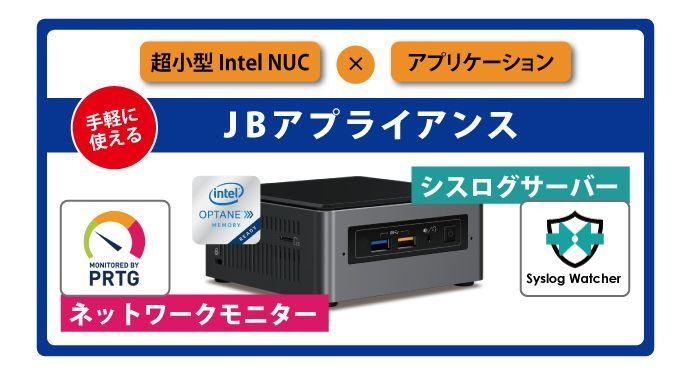 ミニサイズPC Intel(R) NUCをプラットホームに採用したシスログサーバー(EZ5 Systems社 Syslog Watcherプリインストール)およびネットワークモニター(Paessler社 PRTG Network Monitorプリインストール)アプライアンスです。非常にコンパクトで、低価格を実現したアプライアンスは、小規模ネットワーク管理に特化した製品であり、専任のネットワーク管理者なしで、簡単に運用できます。ミニサイズプラットホームながら十分なハードウェア能力を持ち、きわめて快適に利用できます。