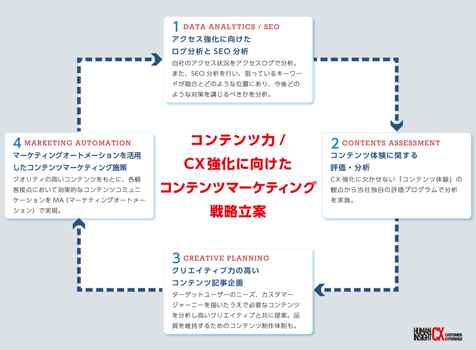 本サービスではCX(顧客体験価値)向上のためにコンテンツマーケティング戦略を立案し、「アクセス強化に向けたログ分析とSEO分析」、「コンテンツ体験に関する評価・分析」、「クリエイティブ力の高いコンテンツ記事企画」、「マーケティングオートメーションを活用したコンテンツマーケティング施策」、の4つの施策によってコンテンツ力を強化します