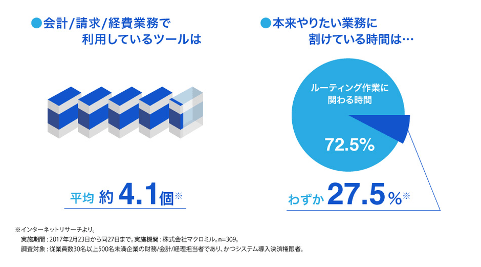freeeが2017年2月に実施した調査結果では、従業員50~500名規模法人のバックオフィスツールの平均利用数は4.1個となりました。従業員規模の拡大と共に煩雑なバックオフィス業務は増加し、業務を効率化できず管理部門の平均人数は3.7人となるなどコストがかさんでいる結果となりました。そのような現状により、本来やりたい業務に割けている時間はわずか27.5%と中堅規模の法人におけるバックオフィス体制の悩みが浮き彫りになりました。