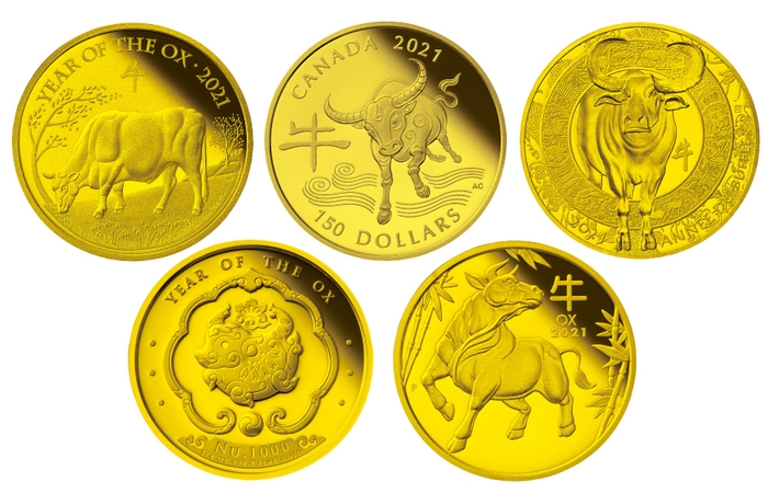 高度な職人技により立体的かつ繊細な表現で牛が描かれた<100ポンド金貨>、幸運を巻き取るという願いを込めた渦巻きの毛並みの牛を描いた<150カナダドル金貨>、牛を正面から描いた斬新な構図と精緻な装飾による芸術性の高い<50ユーロ金貨>、ヒマラヤ山脈に囲まれたブータンの動植物や雲と牛をグラフィカルに表現した<1000ニュルタムカラー金貨>、猛々しい躍動感のある牛を描いた<100豪ドル金貨>など、各国ならではの個性的なデザインとなっています。