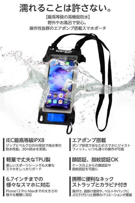 スマホとケースがジャストフィット! 最高等級の防水ケース『エアポンプ付きスマホポーチ』 AmazonとYahoo!ショッピングで販売開始