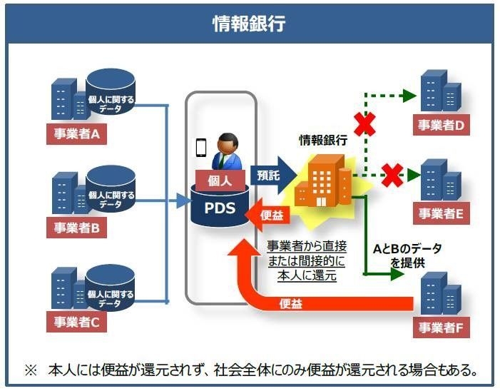 情報信託銀行(情報銀行)とは、個人とのデータ活用に関する契約等に基づき、PDS等のシステムを活用して個人のデータを管理するとともに、個人の指示又はあらかじめ指定した条件に基づき、個人に代わって妥当性を判断の上、データを第三者(他の事業者)に提供する事業のことを指します。