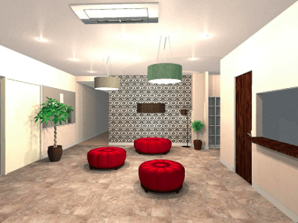 女子学生寮の入口となるエントランス部は、華やかなエントランスを演出しつつ、 線を邪魔しないラウンドタイプのソファベンチを配置しています。