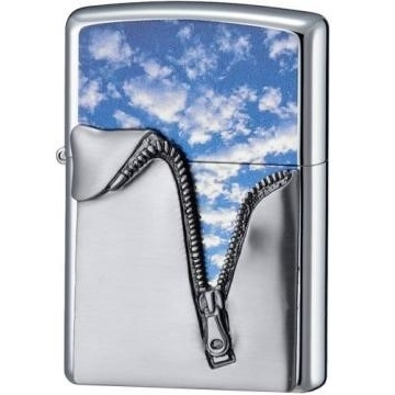 開いたジッパーをモチーフにしたメタルパーツから覗くさわやかな青空がデザインされたユニークなZippoライター。銀古美仕上げで、使うほどに味がでてくるアンティーク調の色合いが魅力的です。