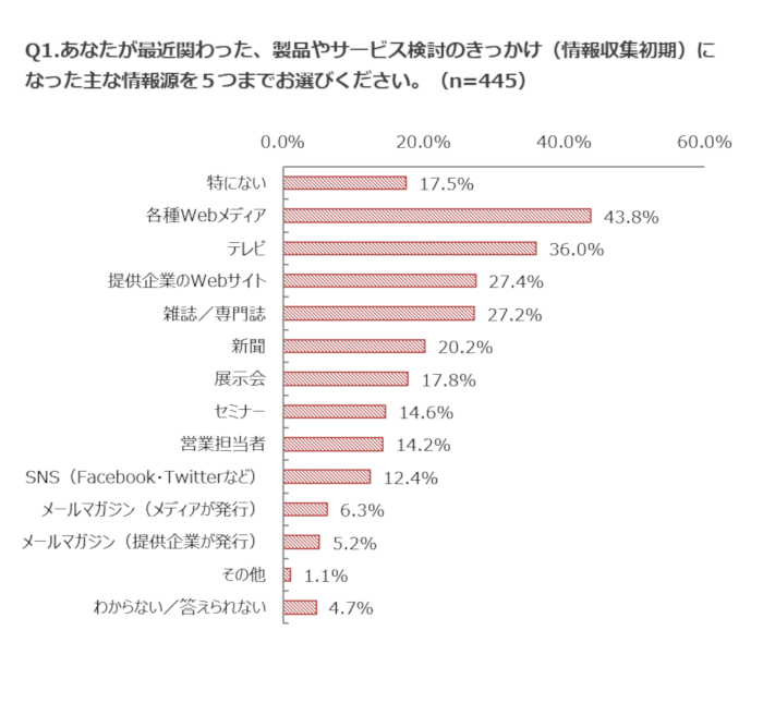 「各種Webメディア」が43.8%となりました。次いで「テレビ」が36.0%、「提供企業のWebサイト」が27.4%。BtoBを対象にした調査ではありますが、検討のきっかけとなった情報源として「テレビ」の比率が比較的高いと感じる方も少なくないのではないでしょうか。