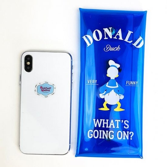 ブルーが爽やかな、ドナルドのデザインも登場です。こちらも後ろ姿♪スマホと比べると、大きさが分かりやすいでしょうか。コスメポーチやペンポーチとしても使えそうですね。