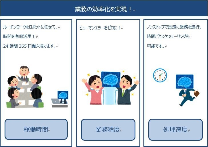 ・業務を細分化してロボットに処理を覚えさせるため、業務の自動化と同時に業務の見直しができます。