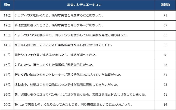 一方で、11位以下に選出されている出会い方では、シェアハウスという現代のライフスタイルならではの場所での出会いから、習い事やジムといった質の高い生活を求めた場所での出会い、そして、SNSの発達によってランクインした「Twitter」からの出会いと、現代人ならではのコミュニケーション手法やライフスタイルの変遷によって選出されたシチュエーションが選出された。