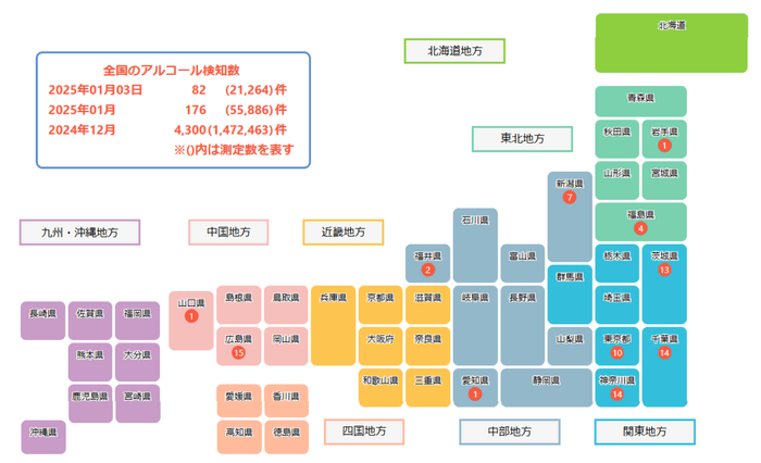 当社は2020年から、当社のアルコール検知器利用企業でありかつクラウド契約をしている事業所が日々実施している飲酒検査データを公開しています(都道府県ごとおよび全国集計)。