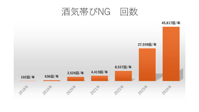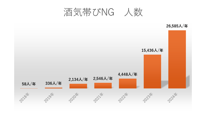 白ナンバーのアルコール検知器義務化施行から1年たったことから、過去5年のアルコール測定者、回数、酒気帯びNG数、NG率をとりまとめました。