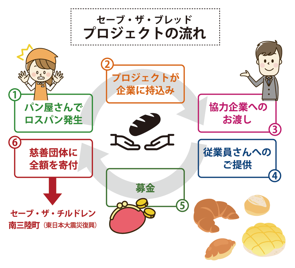 今回の取り組みは次の通り、廃棄されてしまうロスパンを、人に食べて頂き、しかも善意の発端にすることを目指しています。