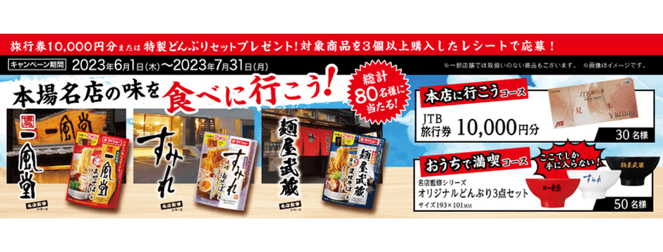 このキャンペーンは、対象商品を購入したレシートを撮影し、WEBサイトより応募すれば、抽選で30名様に「JTB旅行券10,000円分」、50名様に「名店監修シリーズオリジナルどんぶり(3点セット)」が当たります。キャンペーン概要につきましては、以下をご参照ください。