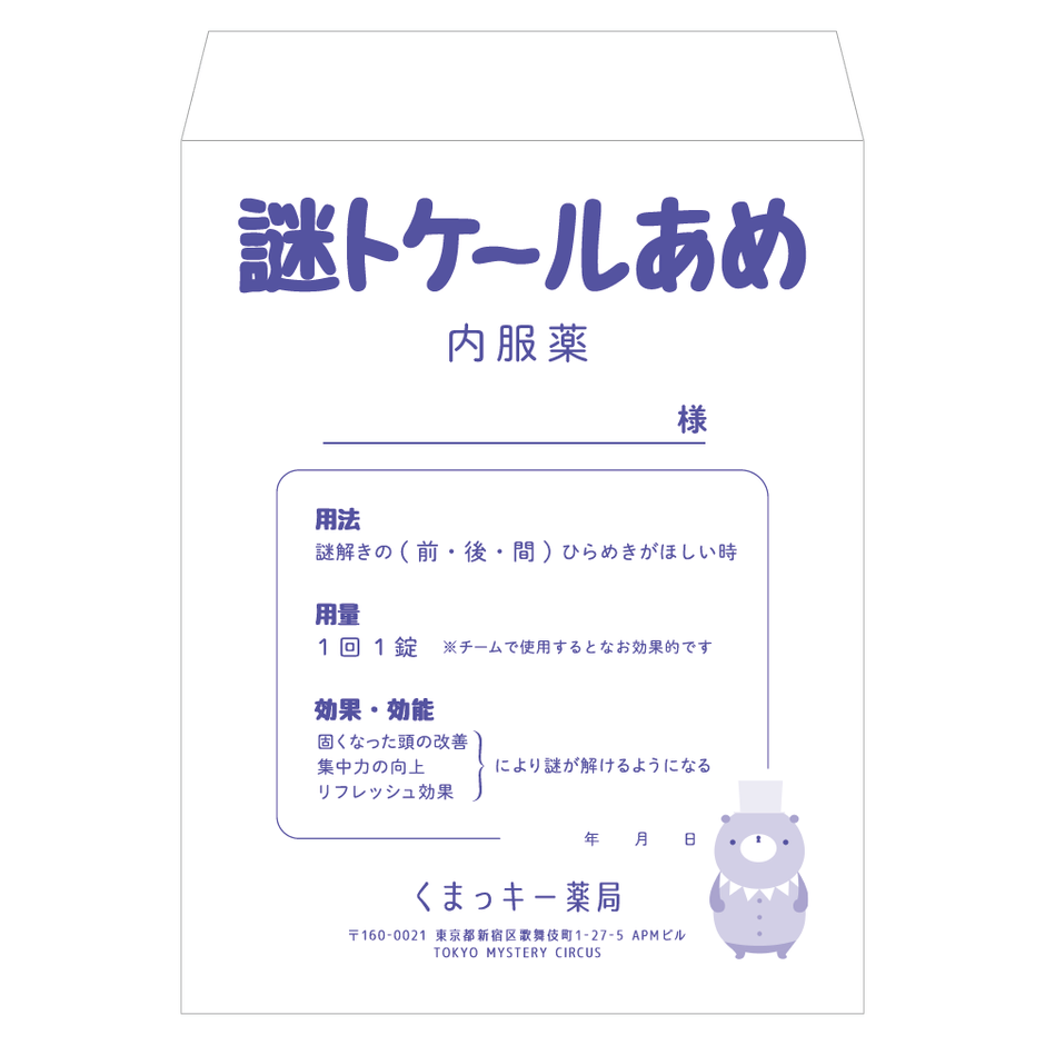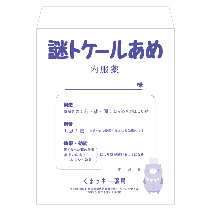 「TMC GOODS SHOP」では東京ミステリーサーカスで公演中のイベントオリジナルグッズの取り扱いに加え、東京ミステリーサーカスオリジナルのグッズも販売いたします。東京ミステリーサーカスで公演のイベントでも役立つこと間違いなしの「ナゾトキボード」に、お土産にも最適な「謎トケールあめ」など、世界一謎があるテーマパークならではのグッズを取り揃えております。さらに"くまっキー"があしらわれたオリジナルタンブラーを購入の方には、「yelo CAFE」でご利用いただけるドリンク引換券をプレゼントいたします。