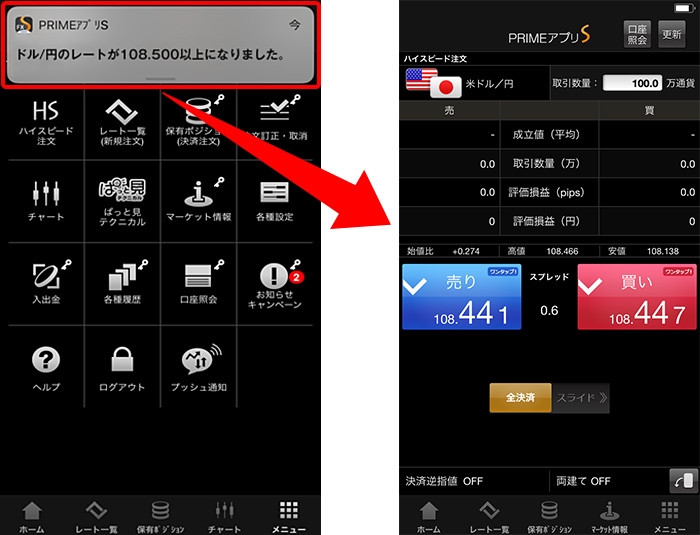 通知をタップすると、選択した通貨ペアのハイスピード注文画面を起動。即座に取引できる!