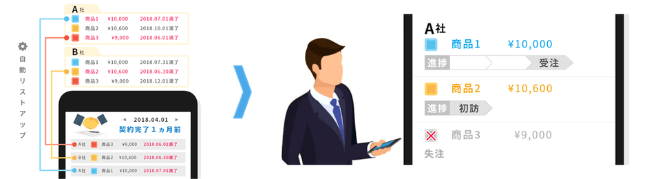 これにより、営業担当者の商談リストには、再提案時期が近づいた商材や部品交換・リプレースの時期が近づいた商材が自動的に追加されますので、計画的かつ適切なタイミングで商談を行うことができるようになります。
