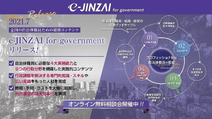 また、2021年7月15日にリリースした全国の自治体職員のためのWEB研修システム「e-JINZAI for government」は、早くも、10の市町村で今期2021年度の導入が決定すると共に、200の自治体で来期2022年度の予算取りを進めていただくなど、地方自治法や地方公務員法で要請されている「『最小の経費で最大の効果』を上げる『計画的・体系的・継続的』な自治体職員研修コンテンツである!」と高い評価を得ています。