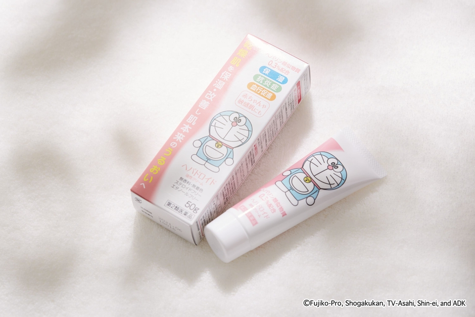 幅広い年代から愛される「ドラえもん」をパッケージに起用した「浅田飴のドラえもんシリーズ」は、2015年に乗り物酔い薬「トラベロップQQ」(第2類医薬品)を発売して以来大変ご好評いただいており、今回の「ヘパドロイド油性クリーム」で5品目となります。