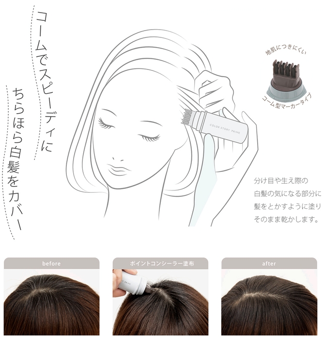 ブラシタイプの容器を採用し、気になる部分に直接塗布するだけで簡単に白髪をカバー。忙しい朝や外出前にも手軽にご使用いただけます。