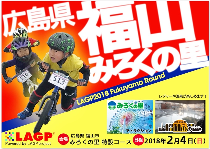 みろくの里(所在地:広島県福山市藤江町638-1 TEL.084-988-0001)では、2018年2月4日(日)、キッズバイクレース[*]“LAGP2018 Fukuyama Round”をみろくの里特設会場で開催します。対象は2歳から9歳のお子さまで、エントリーを1月29日(月)まで受け付けています。