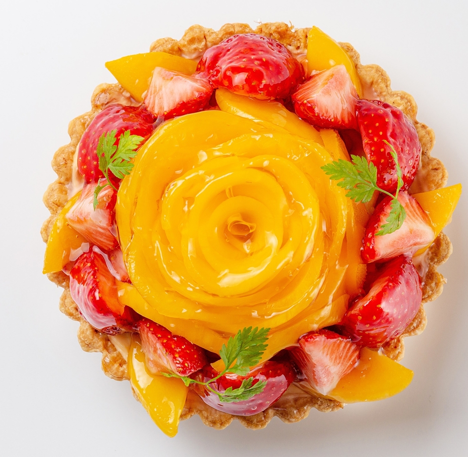 果物の美味しさをより引き立てる当社オリジナルのクリームと、華やかな甘いマンゴーと可愛らしい赤いいちごの酸味が絶妙なタルトです。