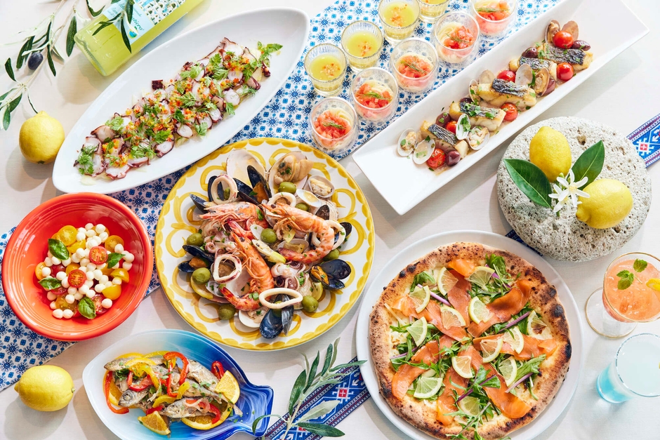 地上180mのパノラマビューに囲まれた空間で楽しむブッフェのテーマは「地中海リゾート」。パエリアやシーフードマリネなど新鮮な魚介類やオリーブオイルを贅沢に使用し、ハーブやフレッシュレモンで爽やかに仕上げました。