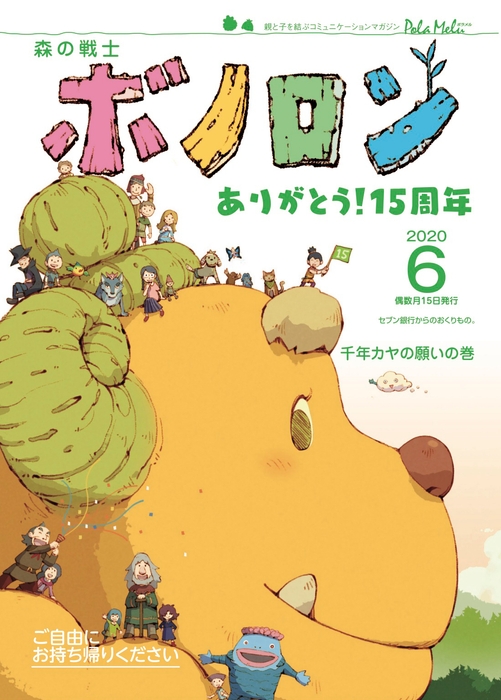親と子を結ぶコミュニケーションマガジン「ポラメル」。『森の戦士ボノロン』は、その「ポラメル」にて連載しています。6月15日より配布開始の「ポラメル」6月号は15周年記念号。本編『千年カヤの巨木の巻』のWEB絵本は声優の中尾隆聖さんが読み聞かせを担当しています。また、巻末のアンケートご回答でハードカバー絵本いずれか1冊を抽選で100名様にプレゼントいたします。