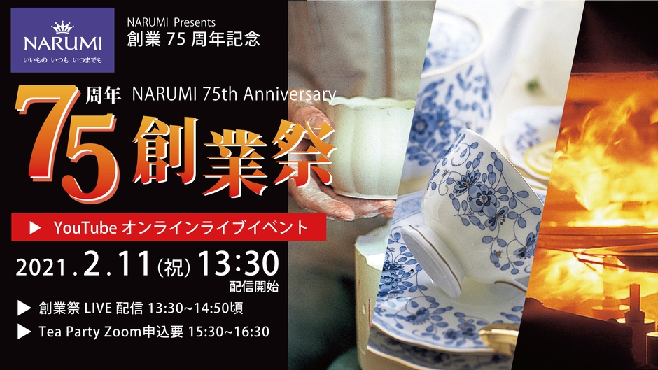 ボーンチャイナをはじめとする上質な洋食器を中心に、食器周りのライフスタイルを提案する鳴海製陶株式会社(本社:愛知県名古屋市、代表取締役社長:福井 俊成)は、2月1日に創業75周年を迎えました。75周年記念行事として2021年2月11日(木・祝)に「NARUMI Presents 75周年創業祭」と題して、第1部にYouTube Live、第2部にオンラインミーティングツールZoomを取り入れた交流イベントを開催いたします。