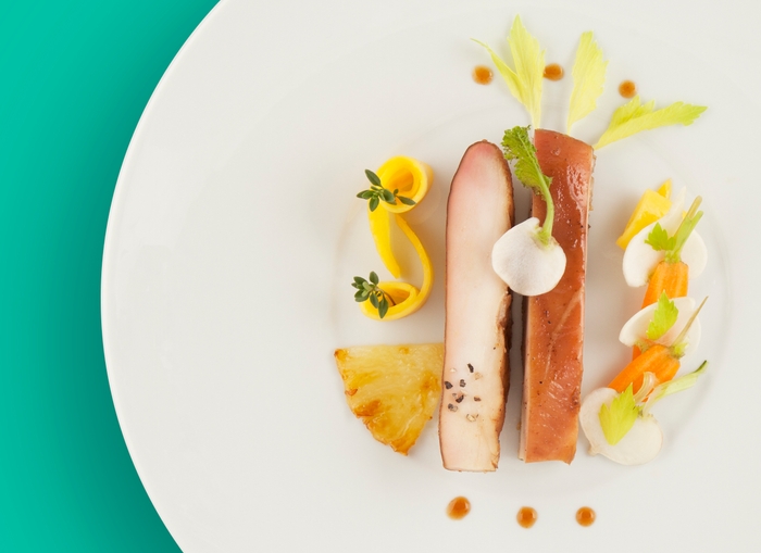 ・柑橘系の蜂蜜と胡椒で味付けした鶏の照り焼き風、パイナップルとマンゴの飴掛け