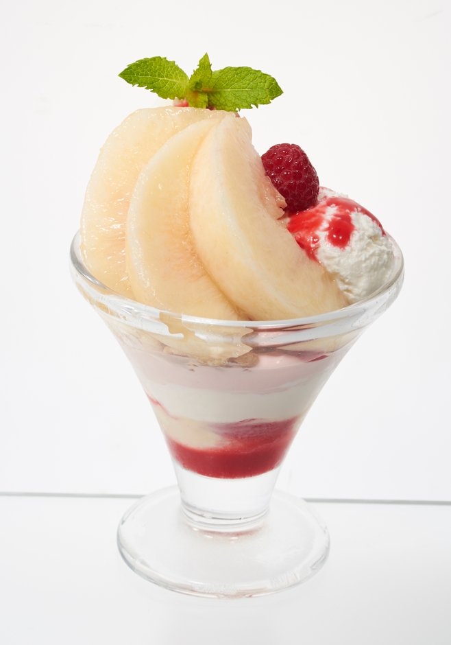 フレッシュな桃、ピーチゼリー、桃クリーム、ピーチソースなど、桃の魅力が存分に詰まったサンデーです。