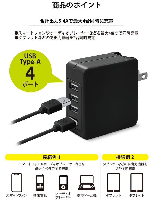 ・4つのUSB-Aポート搭載した合計出力5.4A出力のUSB電源アダプタです。