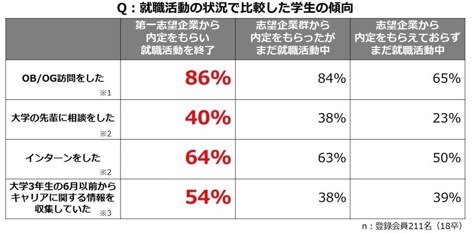 ■志望企業から内定をもらった学生群は、「OB/OG訪問」など生の情報を積極的に収集。