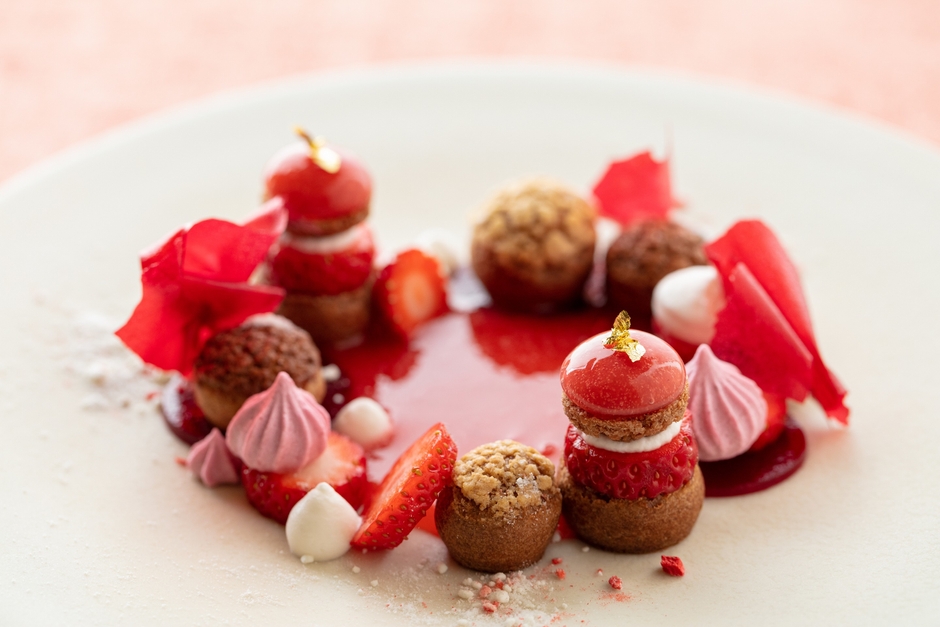 メインのデザートでは、小さなシュークリームを重ねて作る「プロフィットロール」をアレンジし、クリスマスリースをデザインしました。リースは、その形が終わりのない円(えん)を描くことから永遠を表します。クリスマスをともに迎える大切な人との縁(えん)がいつまでも続くように、という願いを込めたひと皿です。シュークリームには、ホワイトチョコレートのアイスと、薔薇のアイスが入っています。その上に、苺のソースが詰まった赤いボールや、薔薇の風味がするピンク色のメレンゲを飾りました。リース中央の苺とフランボワーズ、赤スグリを合わせた甘酸っぱいソースにからめて味わいます。