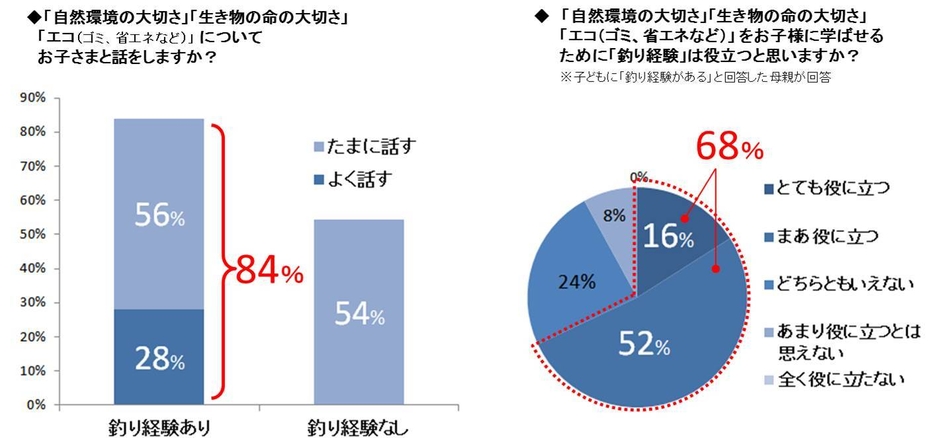 また、釣り経験がある子どもを持つ母親に「自然環境の大切さ」「生き物の命の大切さ」「エコ(ゴミ、省エネなど)」を学ばせるために「釣り経験が役立つか」と聞いたところ、約7割(68%)が役立つ(「とても役立つ」「まあ役立つ」計)と回答しました。