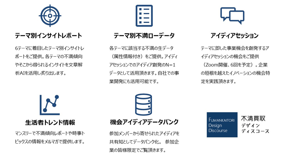 株式会社Insight Tech運営「不満買取センター(特許取得済み)」が保有する1,500万件超の「不満」ビッグデータを活用し、参加企業の担当者が集う年間計6回のオンラインセッション/オンラインディスカッションを通じ、参加企業に生活者が感じる「不」を起点とした事業機会の発見及びビジネスアイディア創発を実践いただきます。