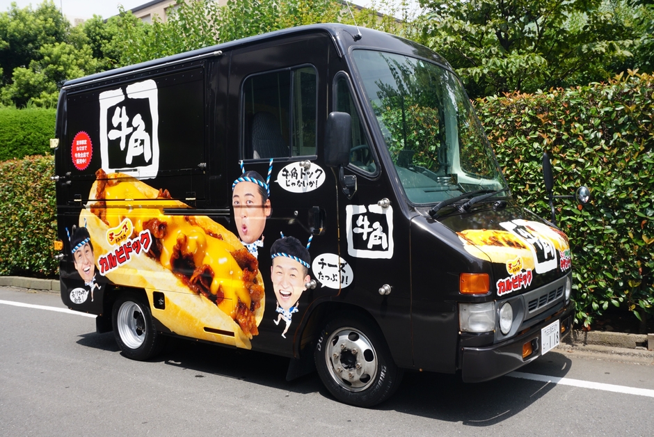 この夏の牛角全店では「牛角夏祭り」と題し、まるでお祭りに行っているかのように、牛角で焼肉を食べながら、みんなで楽しい思い出をたくさん作って欲しい。という思いを込めて期間限定商品の販売や、ツイッター投稿キャンペーンなどを開催中です。そして、この度期間限定でキッチンカー「牛じゃないか号」を製作。デザインにはロバートの3人、牛角のロゴ、ドックのシンプルなデザイン。牛角のお店で販売されており、いま注目の「カルビドック」を各イベントでも販売いたします。また、いろんな街を走行いたします。