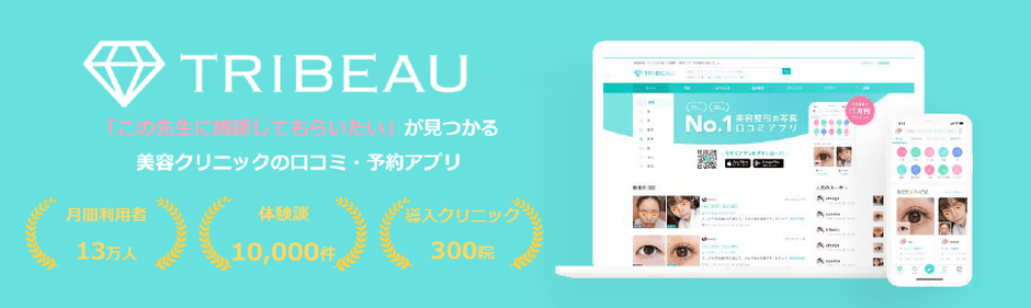 『トリビュー』は国内最大級の美容医療の口コミ・予約アプリです。特長は、会員による30万枚以上のBefore/Afterを含む経過画像投稿と15,000件以上の体験談から、価格・パーツ・満足度別の細かな項目検索で自分に合った施術方法やクリニック・ドクターが見つかる点で、クリニックへのカウンセリング予約もチャット形式で簡単に行うことができます。2020年4月時点で累計ダウンロード数は30万件を突破、予約可能なクリニックは日本・韓国あわせて300院を突破しています。