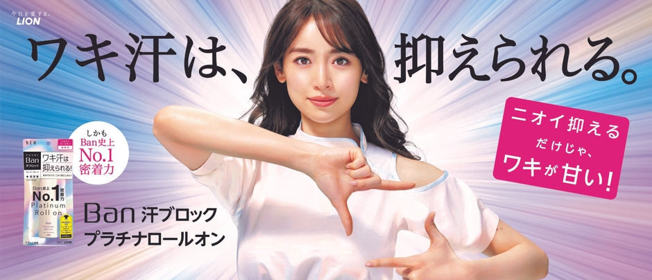 制汗剤ブランドの『Ban』は、2014年に汗ブロックシリーズを発売して以来、暑さが続く夏でもワキ汗対策を訴えてきました。2020年、『Ban』は、『Ban』史上No.1の密着力の『プラチナロールオン』を新発売するとともに、既存品を全面リニューアルし、「ワキ汗は、抑えられる」ことを力強く提案してまいります。そこで、健康的でいて洗練されたイメージがあり、今の時代を生きる女性としての強さを兼ね備えた「泉里香」さんを、新たなメッセンジャーとして起用することにいたしました。