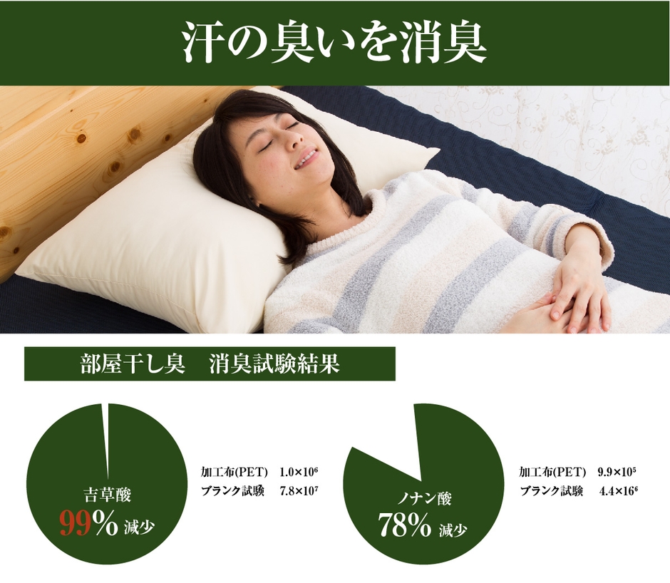 ➀ノネナール(加齢臭)、②酢酸(汗の臭い)、➂イソ吉草酸(足の臭い)を85%以上軽減し、快眠サポート