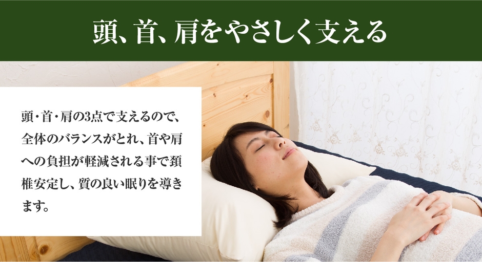 頭・首・肩の3点で支えることで、全体のバランスがとれ、首や肩への負担が軽減される事で頸椎が安定し、質の良い眠りをサポート