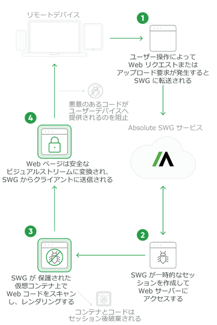 「Absolute Secure Web Gatewayサービス(Absolute SWG サービス)」は、Ericom社のセキュリティエンジンと連携し、複数のアンチウイルススキャン、リモート・ブラウザ・アイソレーション(RBI)、コンテンツ無害化と再構築(CDR)、データ損失防止(DLP)などのセキュリティと保護をクラウドテクノロジーによって提供します。Webコンテンツをクラウドコンテナ上で検査してからユーザーのWebブラウザに配信するため、ユーザーはリンクへのアクセスやファイルのダウンロードを中断することがなく、また組織のリスクを増大させることなく、Webブラウジングのセキュリティを高めることができます。