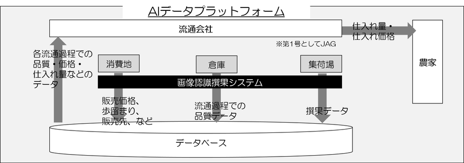 さらに一定期間システムを運用した後にAIデータプラットフォームを利用する流通会社を拡充。流通会社同士が競合をしない仕組みでデータを共有し、仕入れ・販売の適正価格や需要に応じた仕入量の目安を形成することで、輸出数量の増加、結果として生産農家の利益率向上、収益の安定に貢献します。また出荷価格がより早くわかることから生産農家への決済期間が短縮され、生産農家のキャッシュフローを改善させることも目指します。